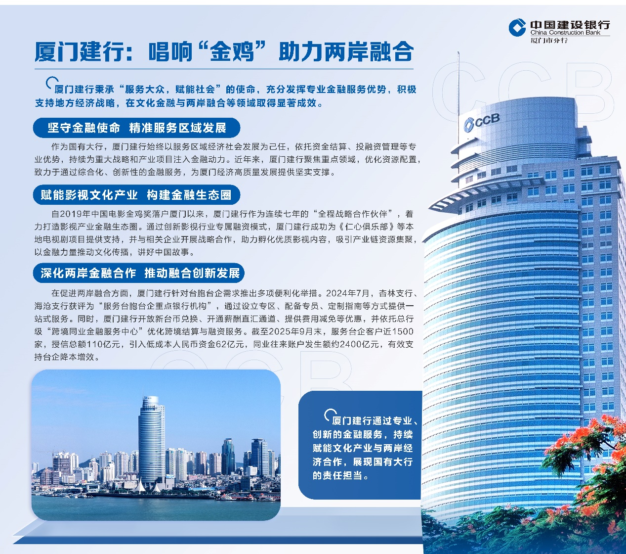 “服务大众,赋能社会”一直是建设银行作为国有大行的使命和担当。2019年,中国电影金鸡奖落户厦门,厦门建行连续七年作为电影节的“全程战略合作伙伴”,充分发挥资金结算、投融资管理等金融服务的专业优势,携手打造影视产业金融生态圈,为影视产业链上下游单位和个人提供丰富多元的“金融+影视”服务,凝聚行业力量,助力“金鸡”展翅高飞,奏响影视产业金融生态的华美乐章。